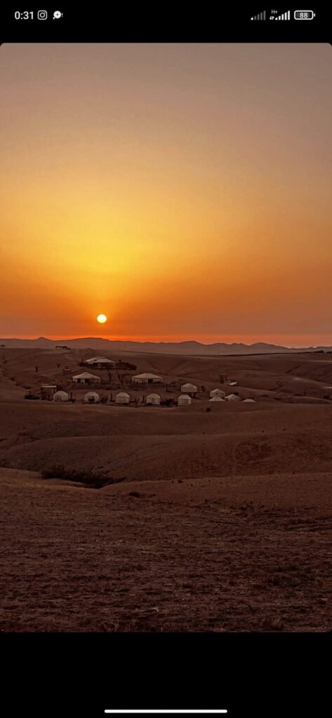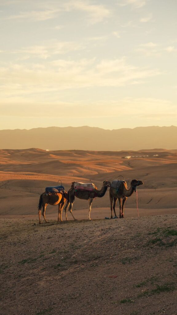 Agafay Sunset Camel Ride in the beautiful Agafay Desert, just outside Marrakech. Ride a camel through stunning desert landscapes and watch the sunset over the Atlas foothills for a truly authentic Moroccan desert experience.