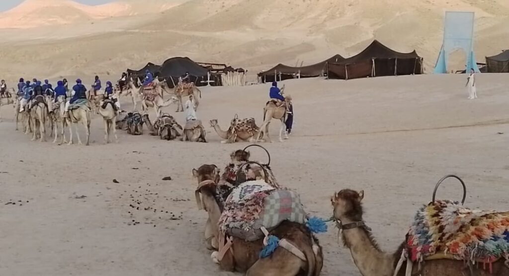 Escape the city of Marrakech and enjoy a peaceful camel ride in the Agafay Desert, located just a short drive away. Traverse the rocky desert landscapes as the sun begins to set, capturing the golden hues of the Agafay Desert. Relax on your camel, take in panoramic views of the Atlas Mountains, and experience the serene beauty of Morocco’s desert. This adventure is perfect for couples, families, and travelers seeking an authentic desert experience.